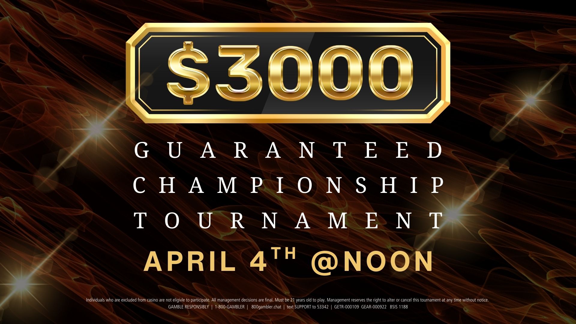 All winners must be present to win and present a valid ID to collect prize. Payment of all taxes is the responsibility of the winner. See casino for complete rules. Must be 21 years old, present valid ID, and be a member of player rewards program to redeem. Individuals who are excluded from casino are not eligible to participate. Management reserves the right to alter or cancel this promotion at any time without notice. All management decisions are final. Please gamble responsibly | 1-800-GAMBLER | 800gambler.chat | text SUPPORT to 53342 | GETR-000109 GEAR-000922 BSIS #1188
