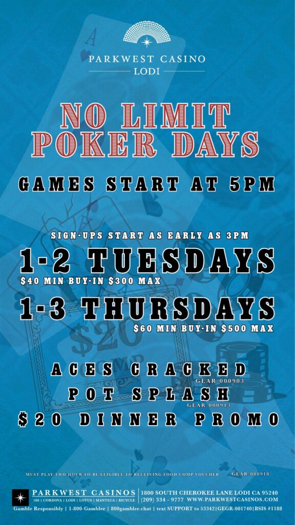 No Limit Poker Days Bounty Poker Tournament TOYS FOR TOTS – DONATION CENTER 2025 PWC Tournament Poker Series POKER PROMOTIONS $2 – $5 : No Limit Hold’em Mondays 3K Guaranteed Championship Tournament Player’s Reward Free Gift Tuesdays Happy Hour Menu Lodi Prime Player Rewards Always Open Multi-Game Progressive Jackpot